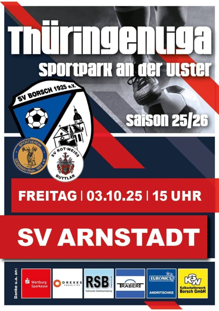 Bewährungsprobe gegen den Tabellenzweiten. Nach einem guten Saisonstart steht für den SV Borsch 1925 am kommenden Wochenende die nächste große Herausforderung an. Mit dem SV 09 Arnstadt gastiert der aktuelle Tabellenzweite der Thüringenliga im Sportpark an der Ulster – und bringt vor allem eines mit: die stabilste Defensive der Liga.